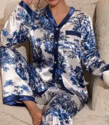 Real Silk Pajama 100% Silk Sleepwear Thin Summer Long-Sleeve Two-Piece SILK Woman’s Sets Female Fashion Printed