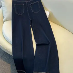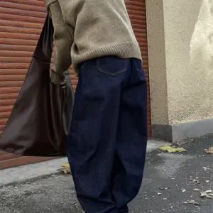 HanOrange Winter Vintage Arc High Waist Wide Leg Jeans Women Thickened Warm Loose Casual Trousers Female Dark Blue