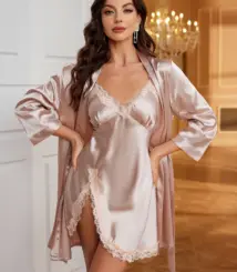 Hot-selling solid-color polyester nightgown lace see-through robe for women 2pcs set