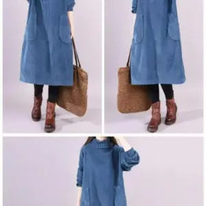 Women Autumn Winter Dress New Retro Corduroy Vestidos Add Velvet High Neck Dress Mid-Length Loose Pullover Sweater Female 2025