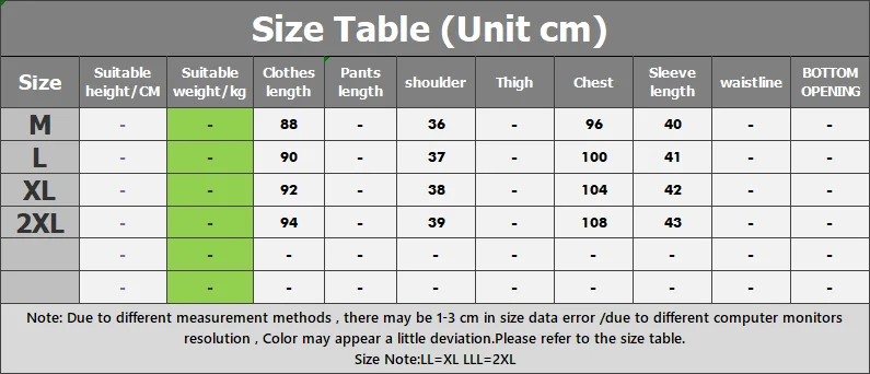 | Note: Due to different measurement methods , there may be 1-3 cm in size data error /due to different computer monitors resolution , Color may appear a little deviation.Please refer to the size table. Size Note:LL=XL LLL=2XL |