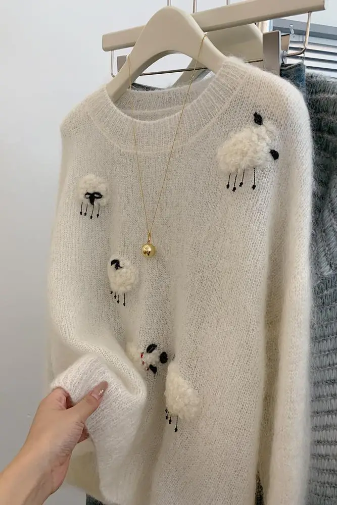 White Casual Sweater For Women 2025 New Long Sleeved O-Neck Warm Knit Pullovers Autumn Winter Korean Cute Animals Woolen Tops