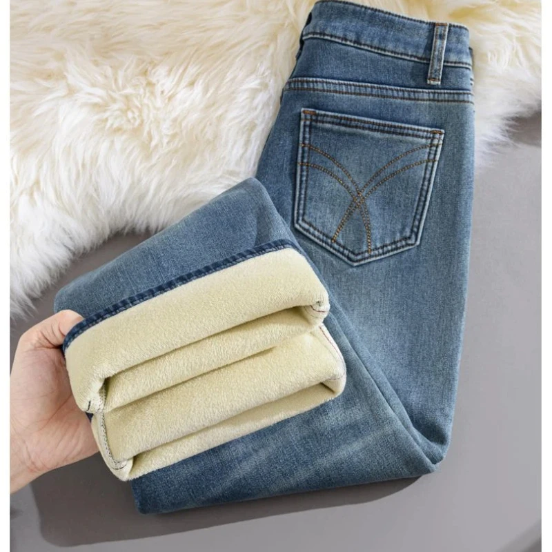 Y2k Pants Jeans for Woman Winter Fleece Lined 2025 New Thick Warmth Slim Wide Leg Straight Trousers Fashion casual